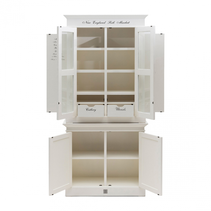New England Fish Market е класика. Най-добрият кухненски шкаф с отделения с етикети, така че всеки да знае какво къде се поставя. Отстрани има място за подправки и готварски книги.