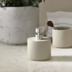 The RM Monogram soap dispenser will feel right at home in your stylish bathroom. When washing your hands, dispensing soap from this pump is a pleasure every time. It is made of light-colored resin and has a matte stainless steel top with a plunger. It features the new RM monogram. A matching toothbrush holder is also available.