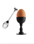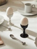Стилен комплект за сервиране на яйца, включващ бяла поставка от термопластична смола и лъжичка с вградена отварачка за рохко сварени яйца. Изработена от висококачествена неръждаема стомана 18/10 с огледален финиш – съчетава практичност и елегантен дизайн за съвършена закуска.