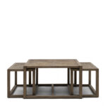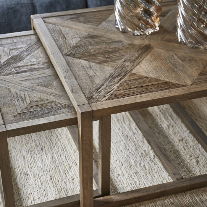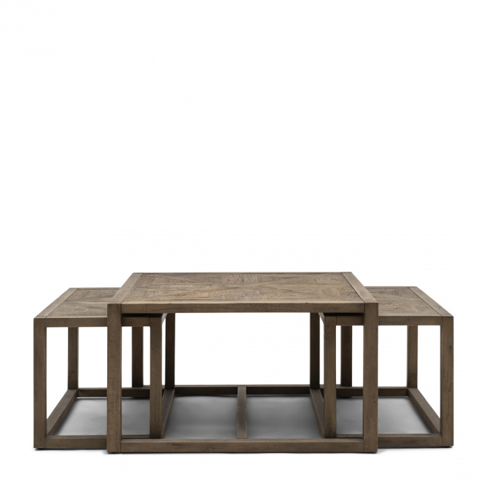 Този комплект от 3 масички за кафе е новото попълнение в линията Romora Bay. Най-голямата масичка е квадратна, с размери 80×80 cm. По-малките масички се побират точно под нея. Комплектът масички е направен така, че да можете да го използвате заедно, но и поотделно, за да направите желаната от вас подредба. Комплектът маси е изработен от рециклиран дъб и има шикозен външен вид със своята шарка рибена кост.